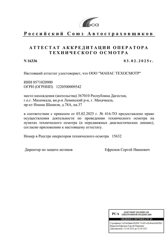 ООО «МАНАС ТЕХОСМОТР» имеет аккредитацию на проведение техосмотра следующих категорий транспортных средств: L, M1, M2, M3, N1, N2, N3, O1, O2, O3, O4. И внесено в реестр операторов технического осмотра за №15632.