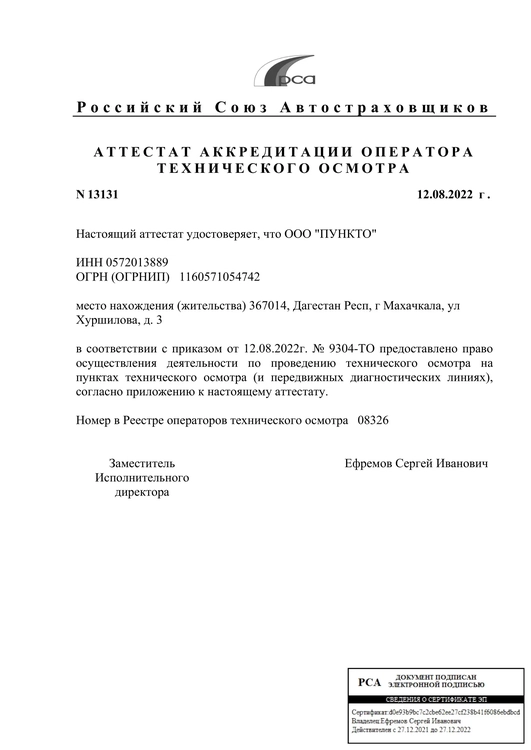 ООО «ПУНКТО» имеет аккредитацию на проведение техосмотра следующих категорий транспортных средств: L, M1, M2, M3, N1, N2, N3, O1, O2, O3, O4. И внесено в реестр операторов технического осмотра за №8326.